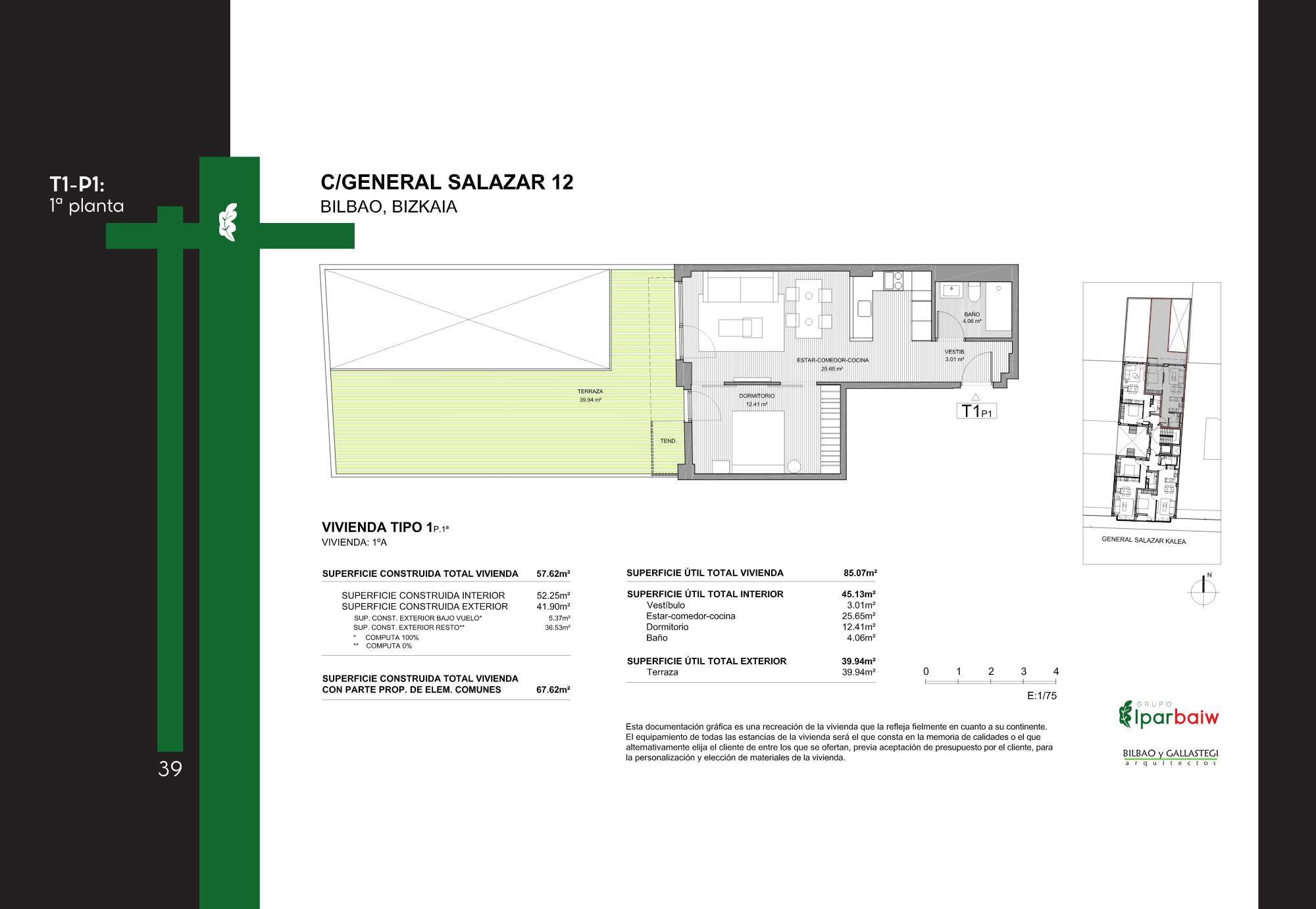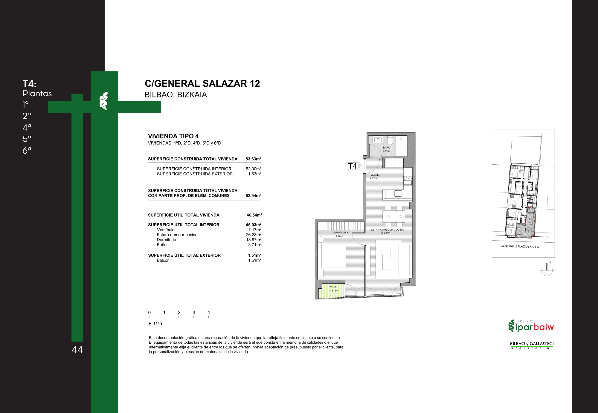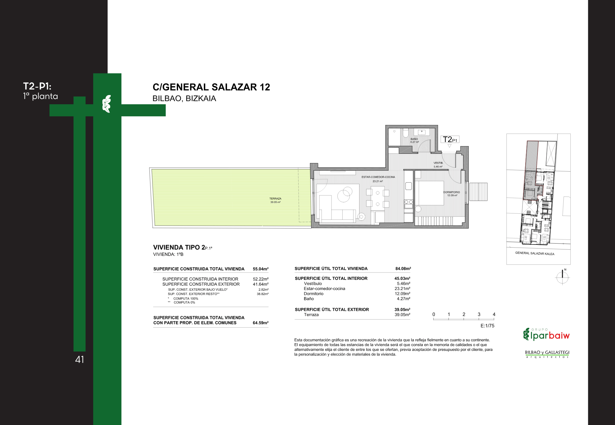 El conjunto ofrece una variedad de viviendas con diferentes superficies y distribuciones, orientadas a cubrir distintas necesidades residenciales. Su localización en un ámbito urbano consolidado de Bilbao permite un acceso cómodo a servicios, transporte y equipamientos, integrándose de forma natural en la trama de la ciudad.